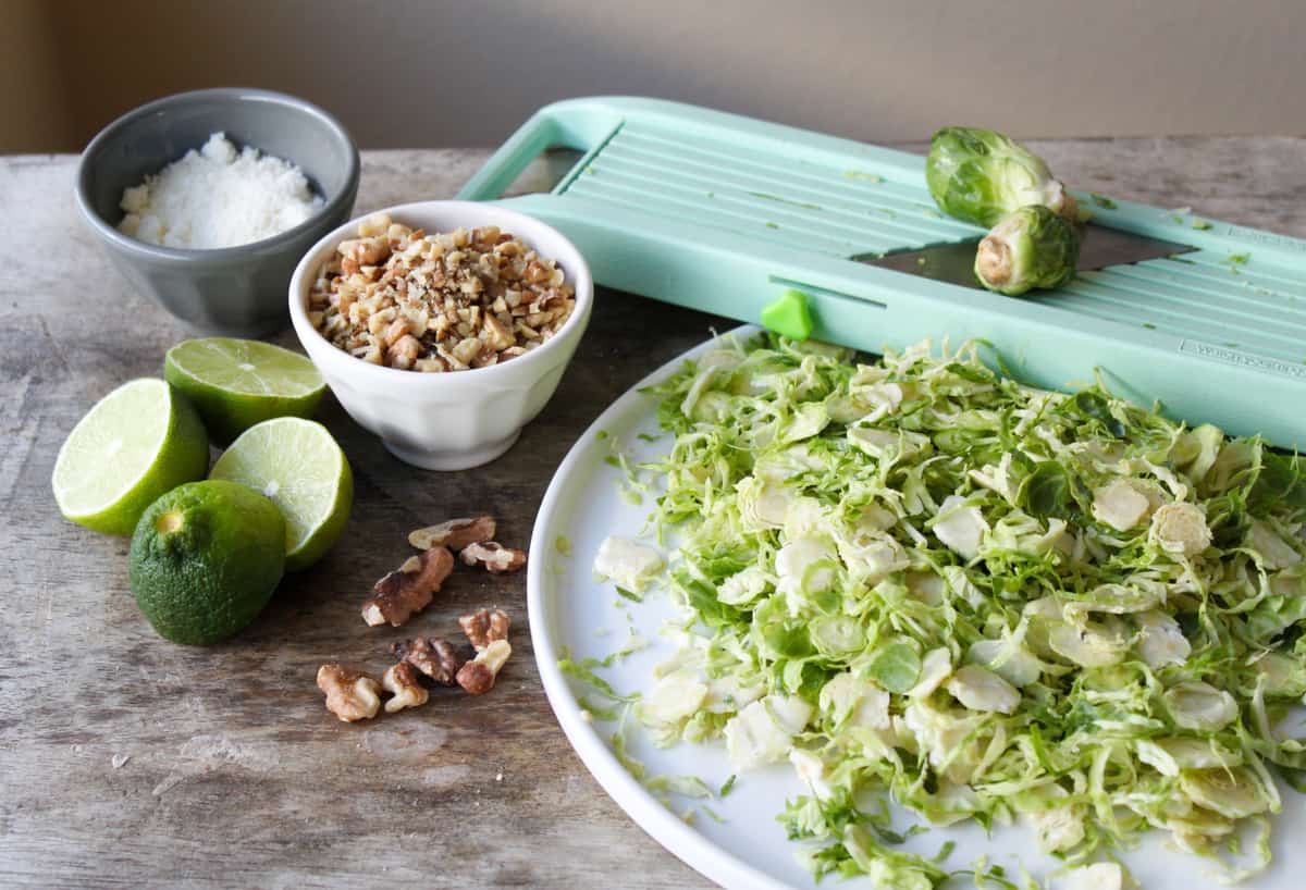 Shaved brussels sprouts salad combines raw brussels sprouts with Pecorino Romano, toasted walnuts, olive oil, and fresh squeezed lime juice. This is a delicious unexpected combination is a wonderful side dish.
