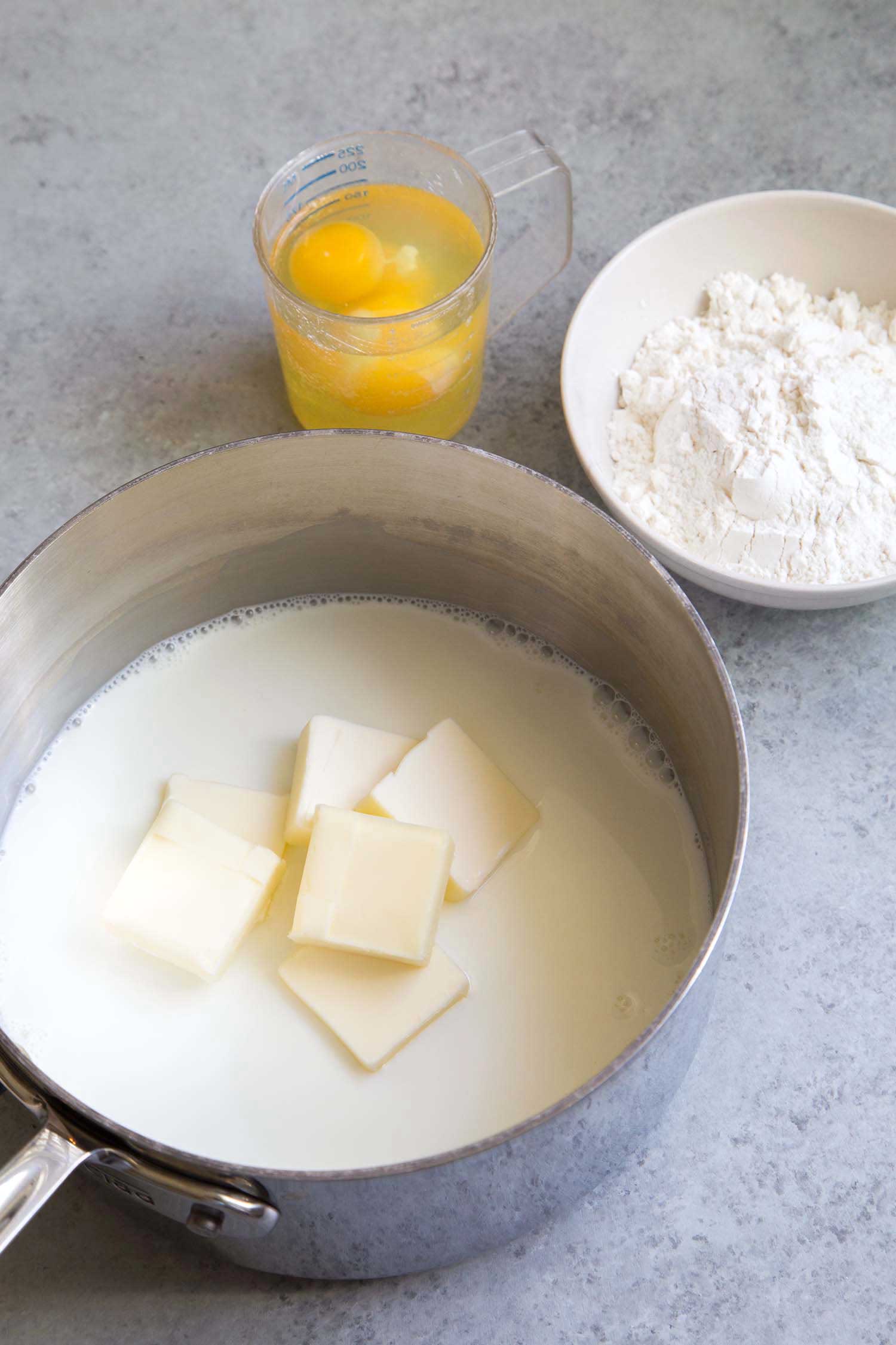 - Milk, butter, and salt are melted together over the stove. Flour is added and quickly stirred in. The mixture will start off lumpy, but with constant stirring, the dough will eventually smooth out.