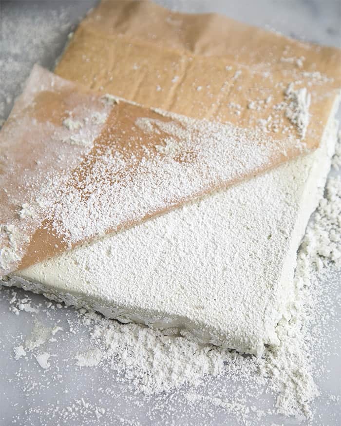 - Remove the giant marshmallow from the pan and place it upside down on a confectioners’ sugar dusted surface. Peel off the parchment bottom of the marshmallow. As you remove the parchment, sprinkle the matcha sugar dusting powder over the exposed marshmallow.