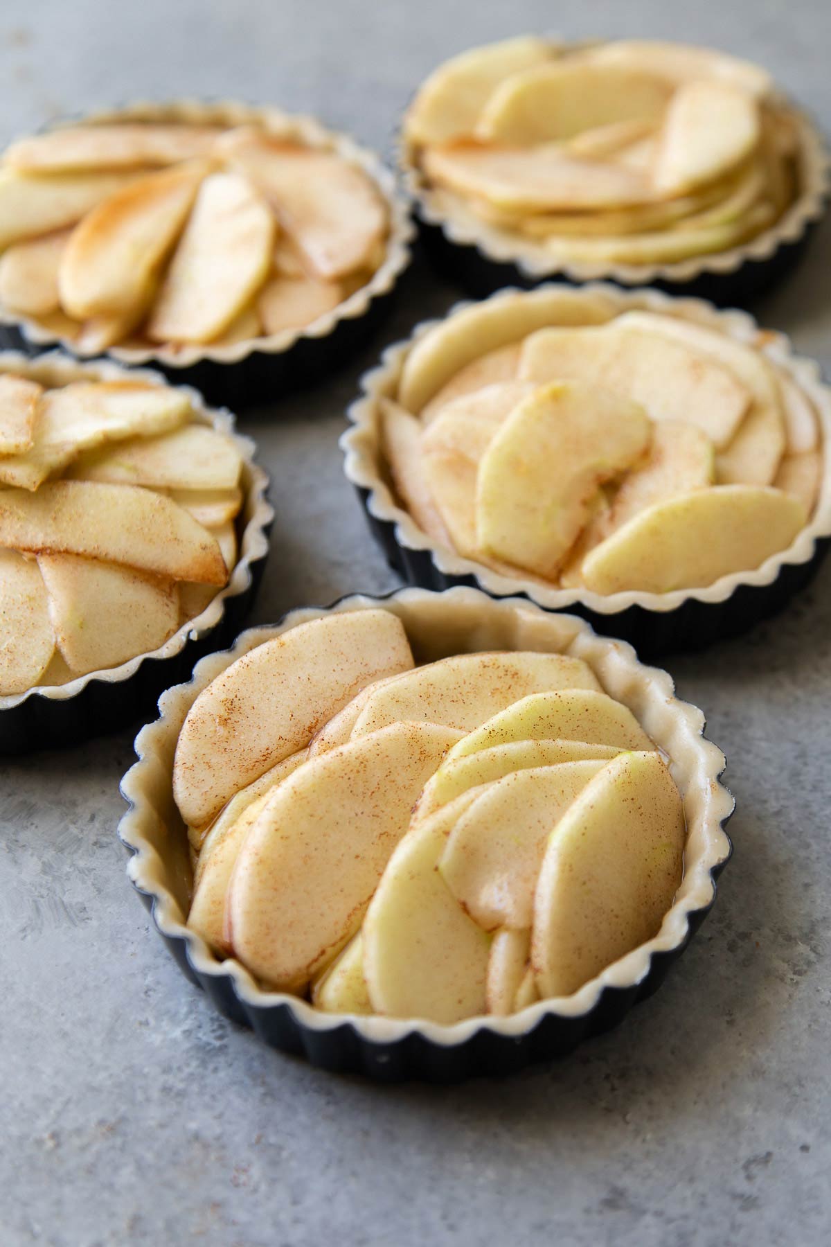 - Roll out dough to about ยผ-inch thickness. Cut out circles a little larger than the tart mod, about 6ยฝ-inches in diameter. Carefully transfer cut out dough to tart shell. Press dough into the tart shell mold. Roll rolling pin over the edges of the tart shell to trim excess dough. Repeat until you have lined six 5-inch tart shells with removable bottoms. Keep in the fridge until ready to fill with apples.