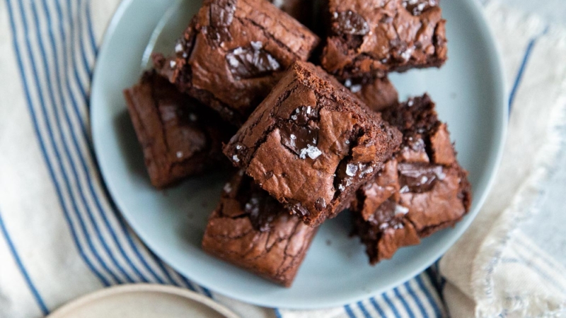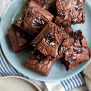- Transfer batter into prepared baking pan. Smooth into an even layer. Sprinkle reserved chocolate on top of batter. Bake for 28-30 minutes until the surface of the brownies are set and a toothpick inserted in center of brownies comes out clean. Immediately sprinkle sea salt flakes on top.