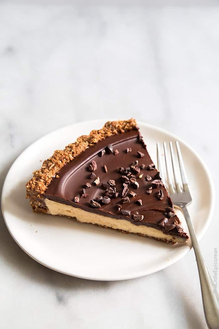 I’m not exaggerating when I say that this tart is AMAZING. The oat crust is a delicious treat in itself. It’s a combination of rolled oats, graham cracker and cocoa powder. Barely pulse the oats in the food processor. I wanted to keep retain the oatiness of the rolled oats. I did not want to end up with oat flour.