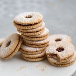 Place rounds on a parchment lined baking sheet, spacing them about 1-inch apart. Use a small 1/2-inch round cutter to punch out center hole in half of the cookie rounds. Let cookie rounds chill in the fridge for 30 minutes while oven preheats.
