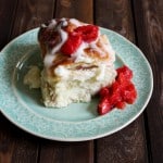 Roll dough into a tight log, starting with the long side. It may get messy and some of the strawberry filling will try to escape. Slice log into 12 equal slices. Place slices in a parchment lined 13x9-inch baking sheet with sheet pan extenders.