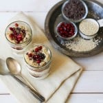 In desired individual serving bowls, layer yogurt, jam, and sweetened quinoa. Top with cocoa nibs and pomegranate seeds.
